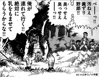 本日発売のスペリオール「あずみ」に出ている「糞ずり」と呼ばれる男がいる。 小山はこのキャラを、今村昌平監督の「楢山節考」に出ている、左とん平が演じた「腐れ」と呼ばれている男をイメージして描いた。 しかし、このキャラを見た瞬間に、おどやんが「あ、銀次郎だ!」と言い出して、それ以来、ゆうプロでは銀次郎は「糞ずり」呼ばわりされ続けている。