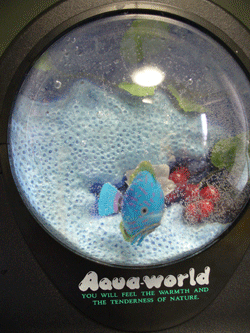 先生が自宅から昔、人に頂いたという魚のインテリアを持って来ました。 その名も「アクアワールド」。 どういう仕組みかは分からないのですが(多分磁石?)電源をオンにするとおもちゃの魚が本物さながらに泳ぎ廻るんです!! 動画で伝えられないのが残念。 先生は久しぶりのアクアワールドにスッカリハマり水槽の中を造花で飾ったりとても楽しんでいました。 だけどその魚は泳いでるうちに体に気泡がくっついて水槽の上の方に浮いてきちゃうんです。 先生はその度に一所懸命、魚の空気を抜いては戻し、抜いては戻し、苦心していました。 で、工夫の結果、魚にクリップで重しをつける事で浮きづらくなりました。 さわやか〜。 ゆうプロにまたひとつ癒しが増えましたなあ。