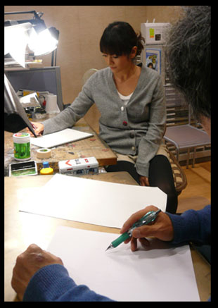 漫画家の仕事場にいらっしゃるのは今回が初めて、という事で、とても熱心に仕事場を見て回られていました。 真木さんにペン入れの様子を見つめられ、大緊張する おどやん始めアシスタント達。