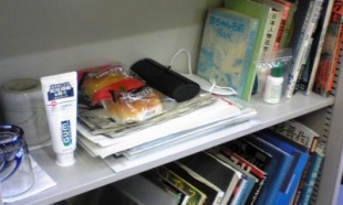 ふと気が付くと小山の本棚にあんパンが有ります 机には柿やみかんが置いて有ります