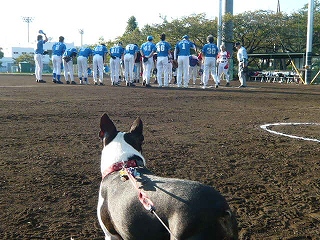 | 9月27日、小山率いる「コピーズ」が草野球をしてきました。相手は高井研一郎先生率いる「大江戸パイレーツ」。監督は中原まこと先生。 今回初めて球場に犬の紋次朗を連れて参りました。紋次朗はそれはそれは大はしゃぎでした。試合が始まる頃には疲れて寝てしまいました。